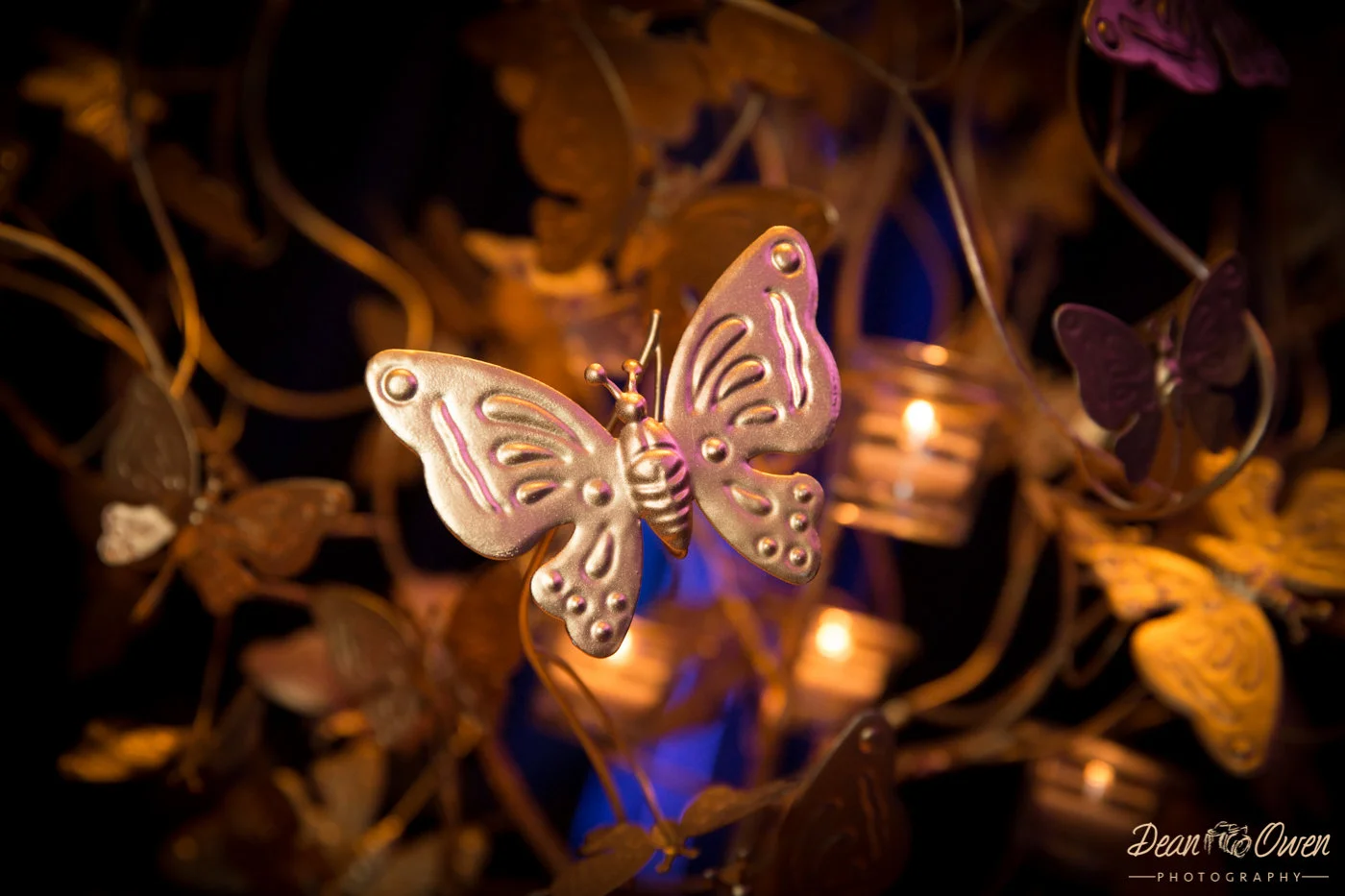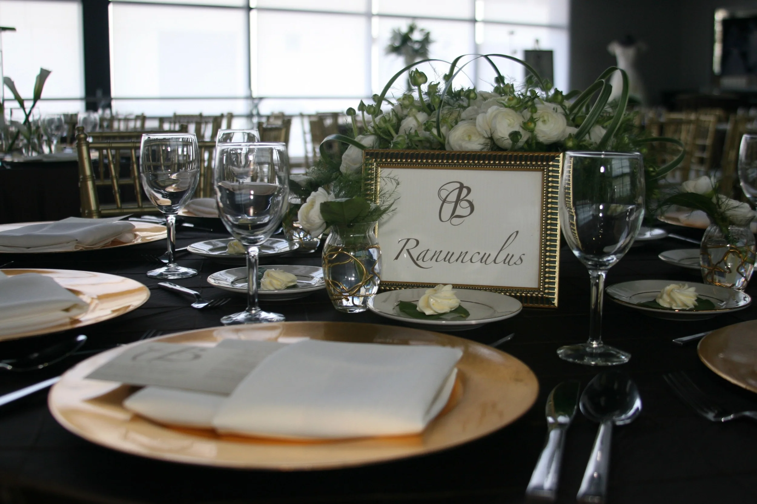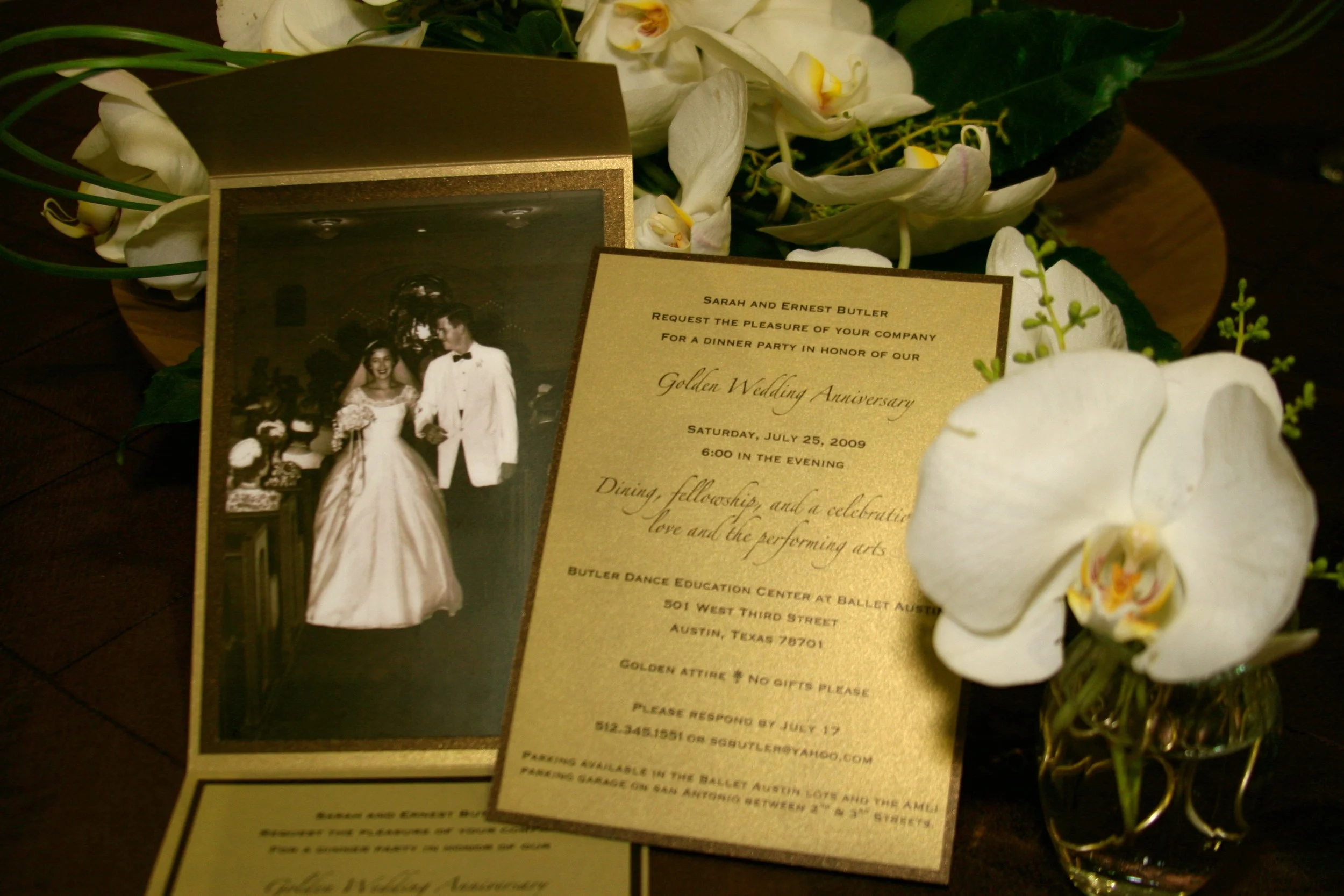 What do the University of Texas Butler School of Music and Ballet Austin’s Butler Dance Education Center (BDEC) have in common? Aside from being world-class artist training meccas, both share the name and benevolence of Sarah and Ernest Butler, beloved Austin luminaries and supporters of the arts. We had the pleasure of helping the Butlers celebrate their 50th Wedding Anniversary. A dance studio at the BDEC played host to a lively dinner colored with wedding white, a dark chocolate brown and of course, GOLD. Sarah loves gardening and so each table was named after and adorned with a different white varietal of flower. The Daisy table featured exact replicas of her bridesmaids’ bouquets from 50 years before. Her wedding dress and album were on display and a replica of her original bridal bouquet was even delivered to the blushing bride’s home that day.